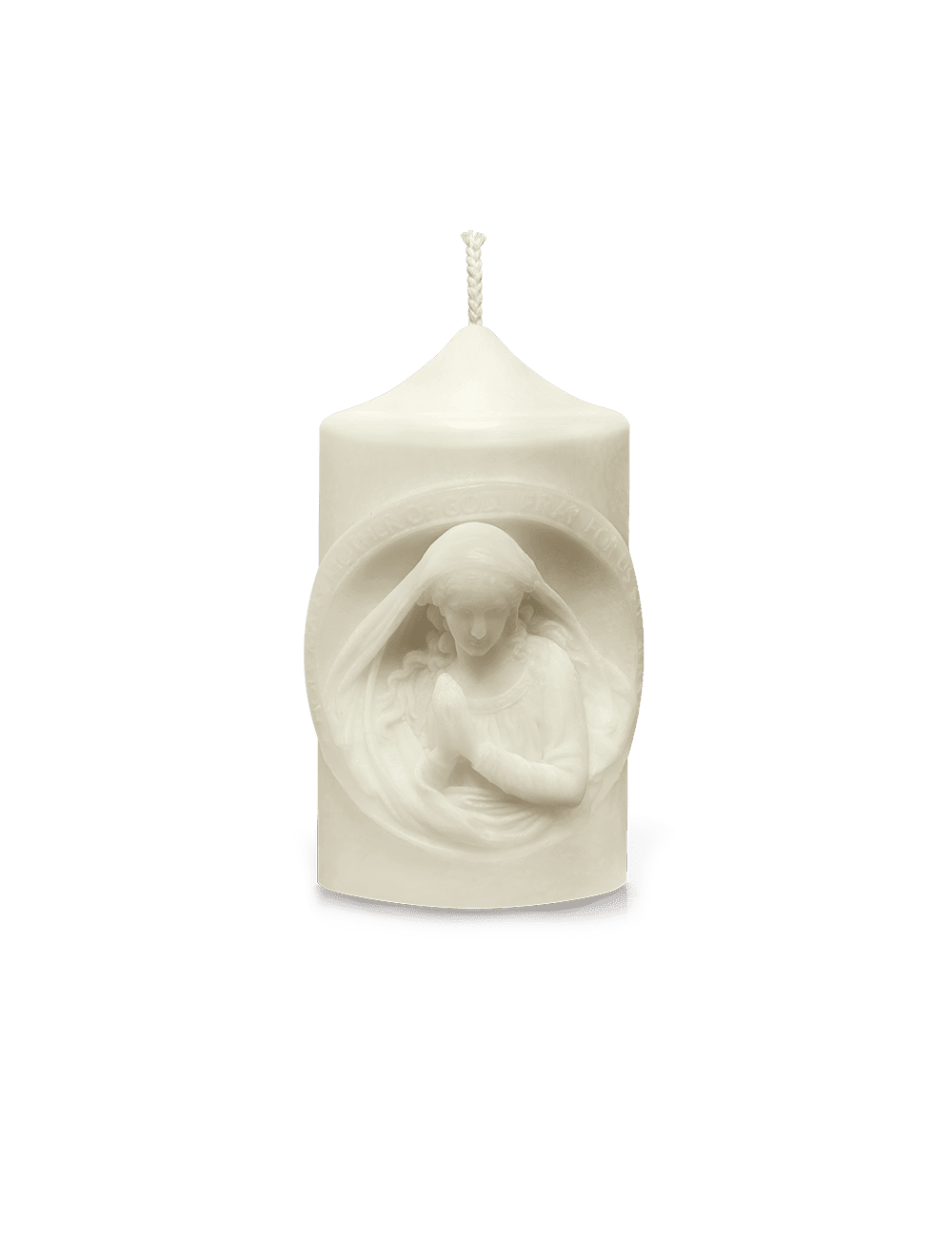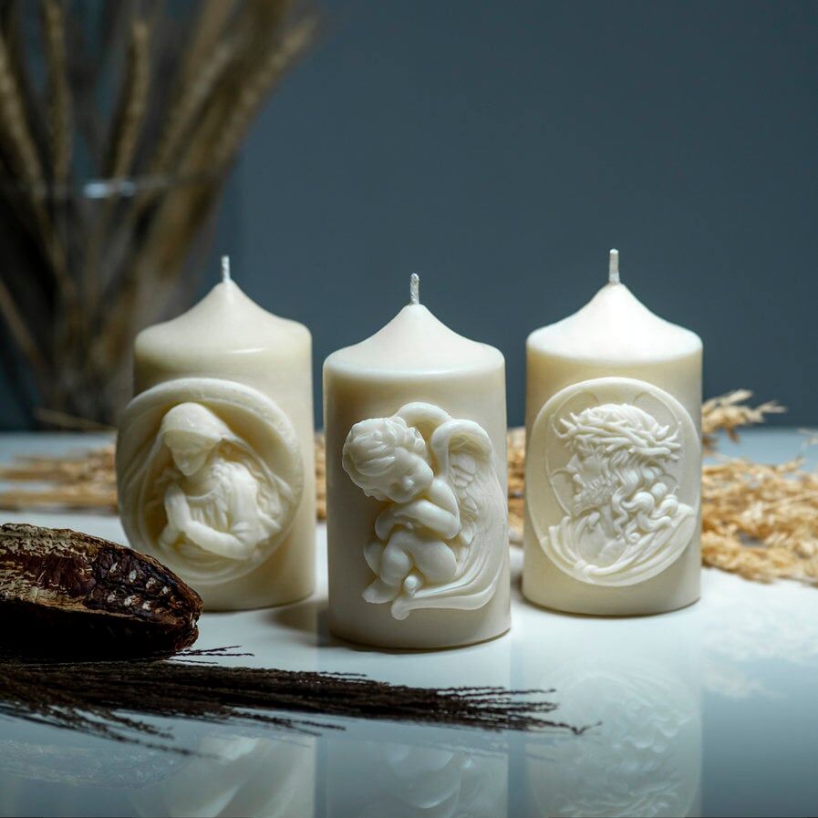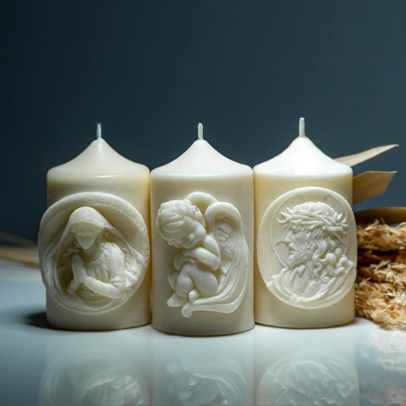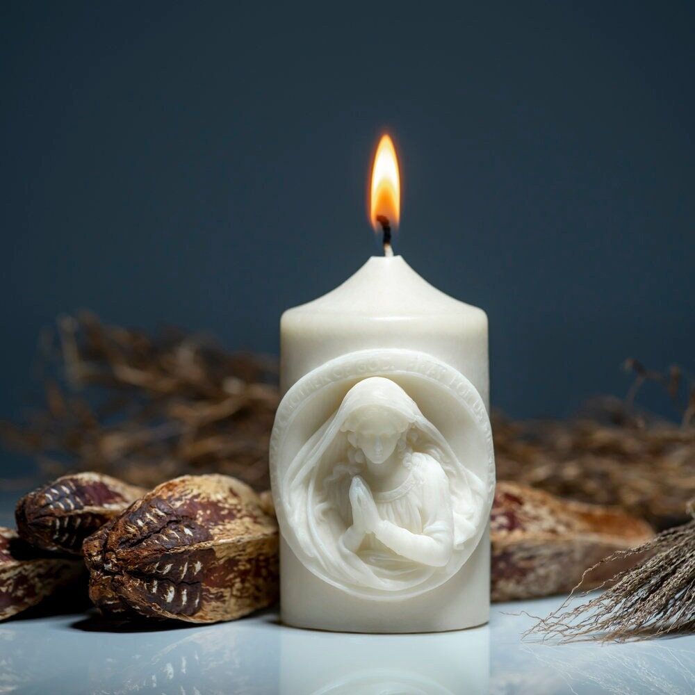 Christian Handmade Scented Candle with PRAYING VIRGIN MARY Bas-relief | with Gift Box Candles Hand-made by Dona Dei Ltd., Lithuania, Europe Union; Materials: 100% Natural Wax and Essential Oil, Cotton Wick, Ivory Candle Dye; Important Note: Beeswax candles do not have any added scent or dye; Size of the Candle: Diameter - 2.6 ...inches/ 6.7 cm, Height - 4.7 inches/ 12 cm; Weight of the Candle: about 13 oz/ 360 grams; Technique: Hand-poured into special forms; Dona Dei is excited to introduce our latest selection of lovely Christian candles. Our candles are carefully crafted from excellent 100% natural beeswax or palm wax. They surpass the standard with stunning Christian designs that are guaranteed to captivate your attention and make perfect Christmas gifts. These exceptional and thoughtful candles are suitable for any occasion. Illuminate any room with our candles, which come packaged in eco-friendly kraft paper boxes. Our candles are beautiful and meaningful. You can select unscented choices or soothing essential oils. Illuminate your surroundings with the heavenly radiance of our handmade Christian candles, making every moment precious. They are elegant and symbolic, making them an excellent gift for friends and family during the holiday. Need further information? If you have any questions, please, do not hesitate to contact me, I'll gladly answer them.
