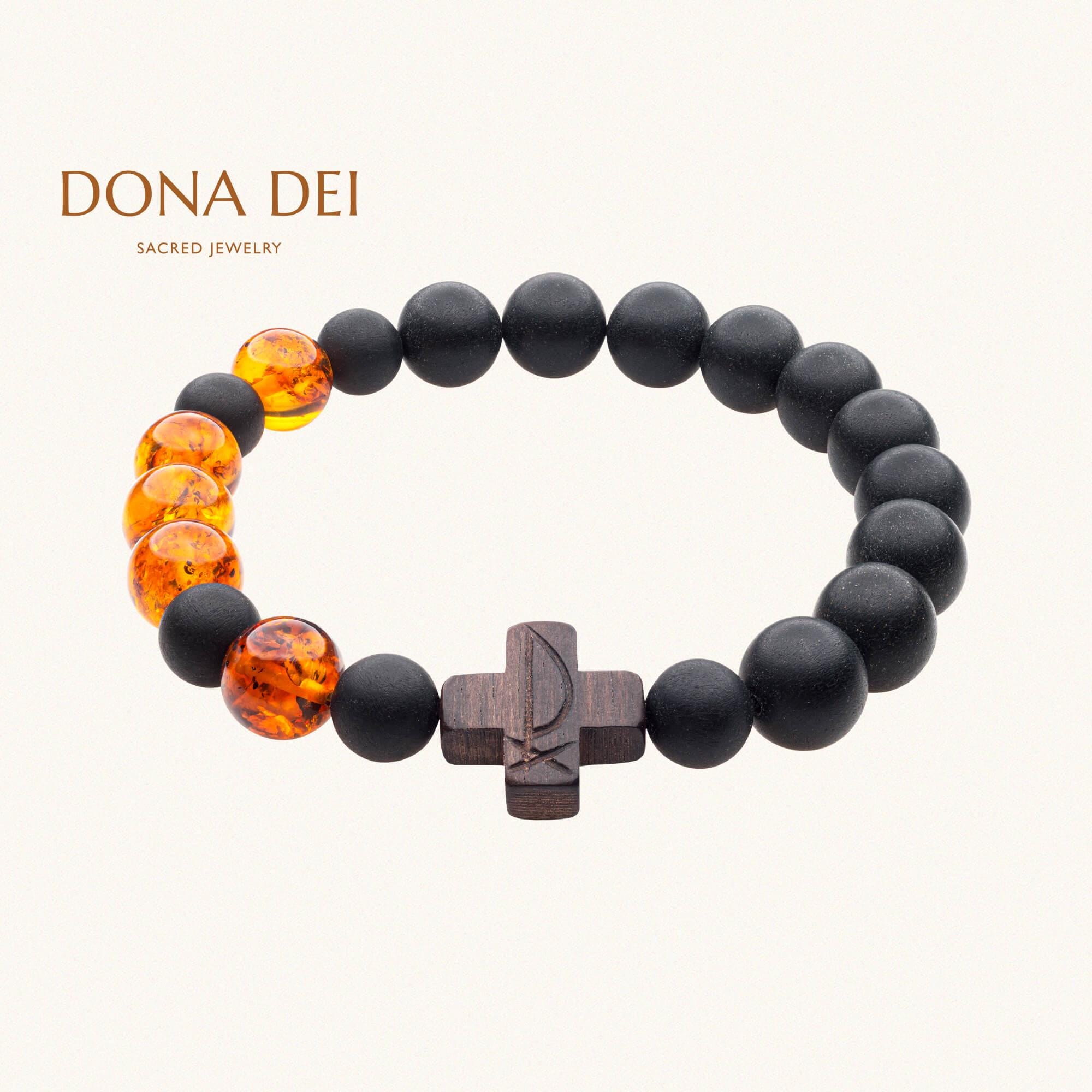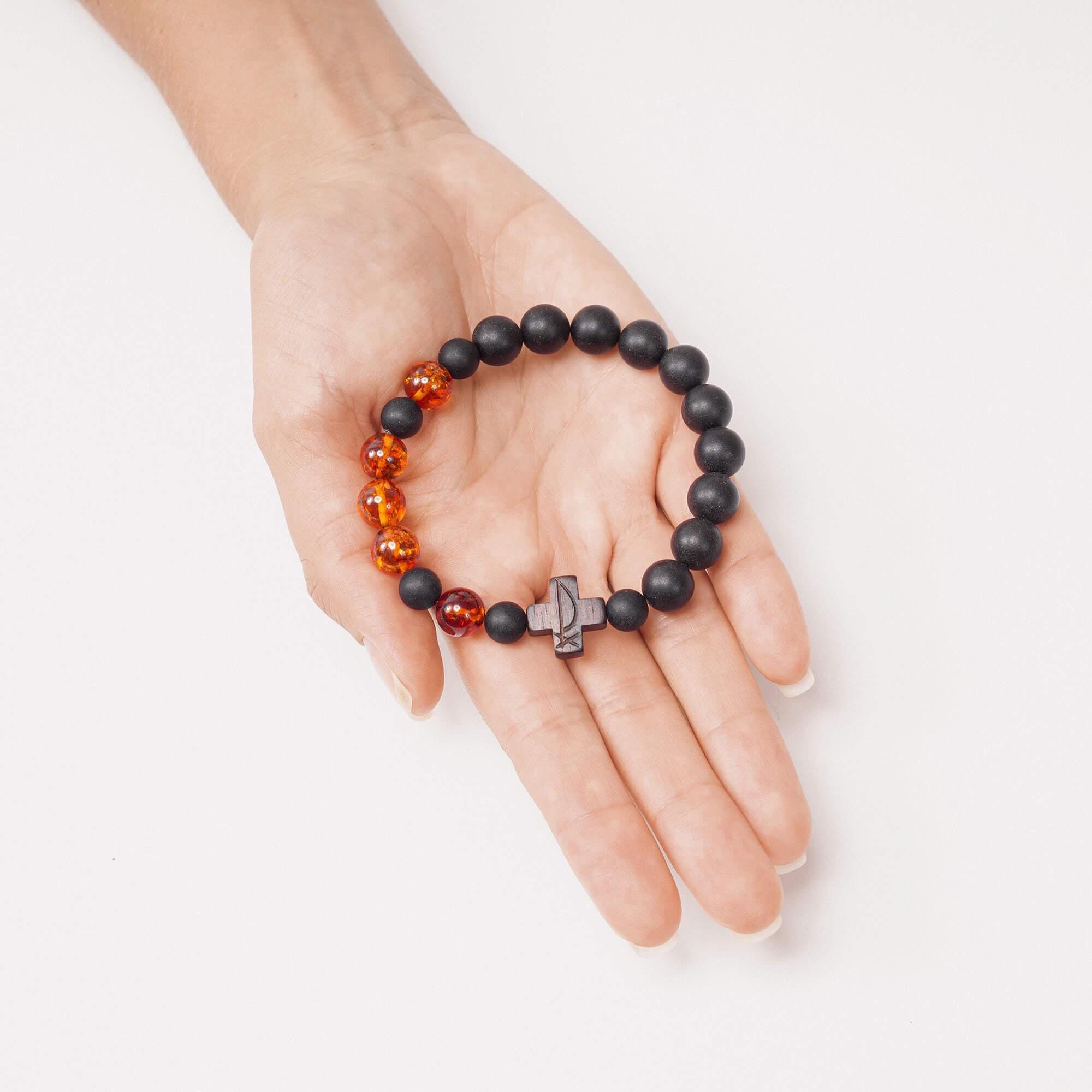 Amber Christian ROSARY BRACELET with Chi-Rho CHRISTOGRAM Symbol on Cross ‘ Polished Cognac & Matte Black Beads ‘ Handmade from Baltic Amber & Tiger Ebony Wood