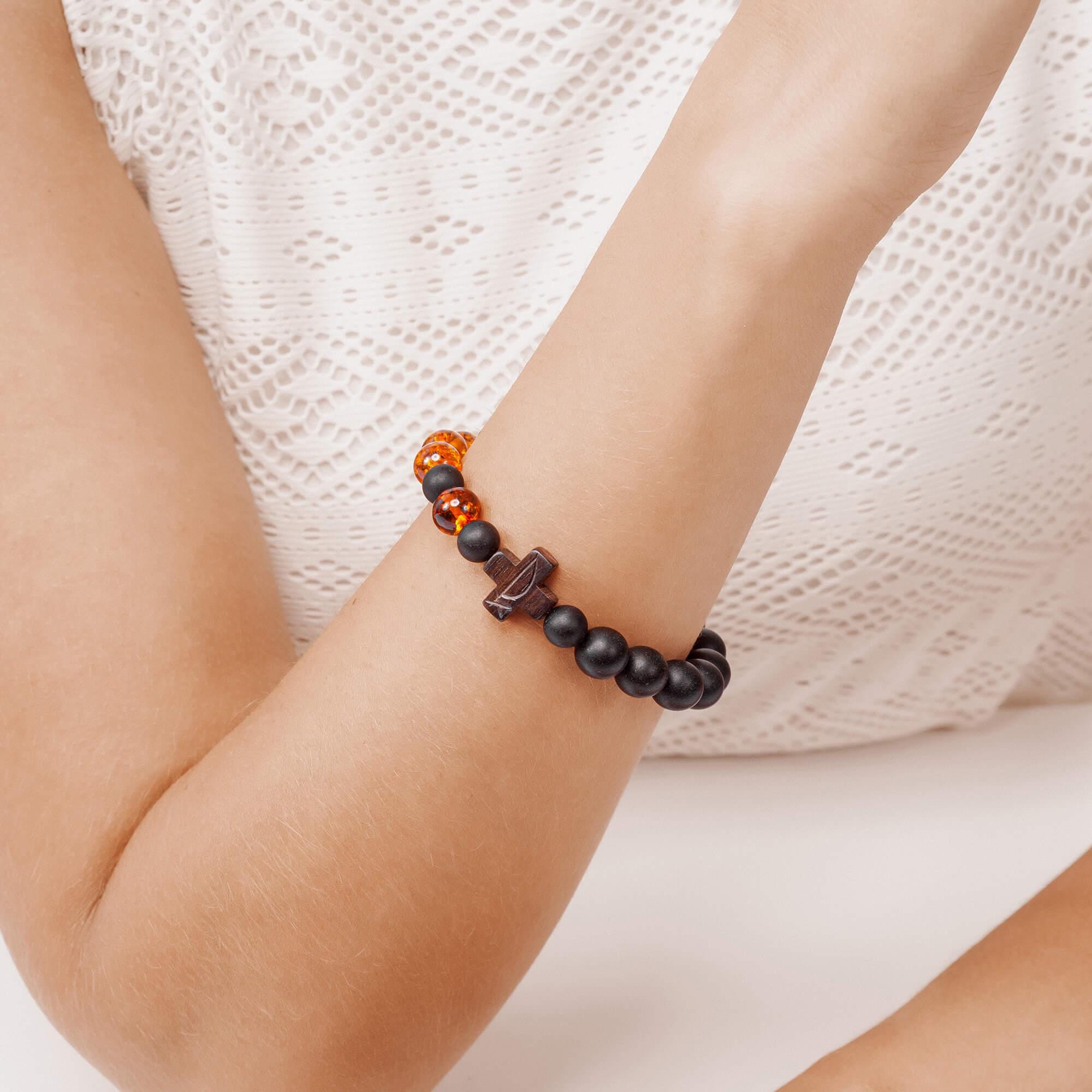 Materials: Polished cognac amber beads made from genuine Baltic amber; matte black beads crafted from molded Baltic amber without any additives; cross made from Philippine-origin Tiger Ebony Wood.
