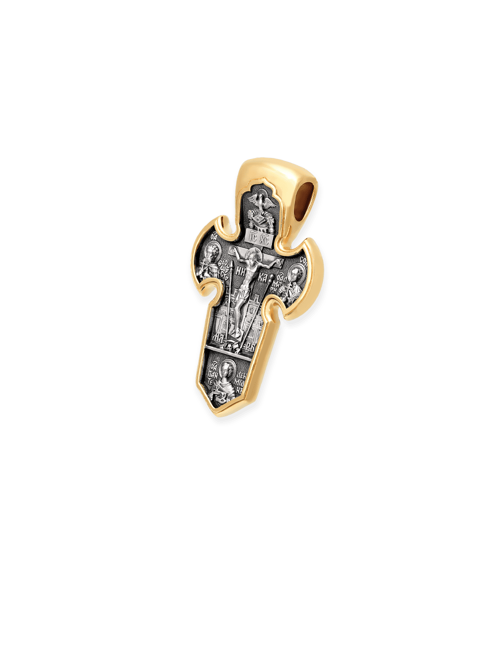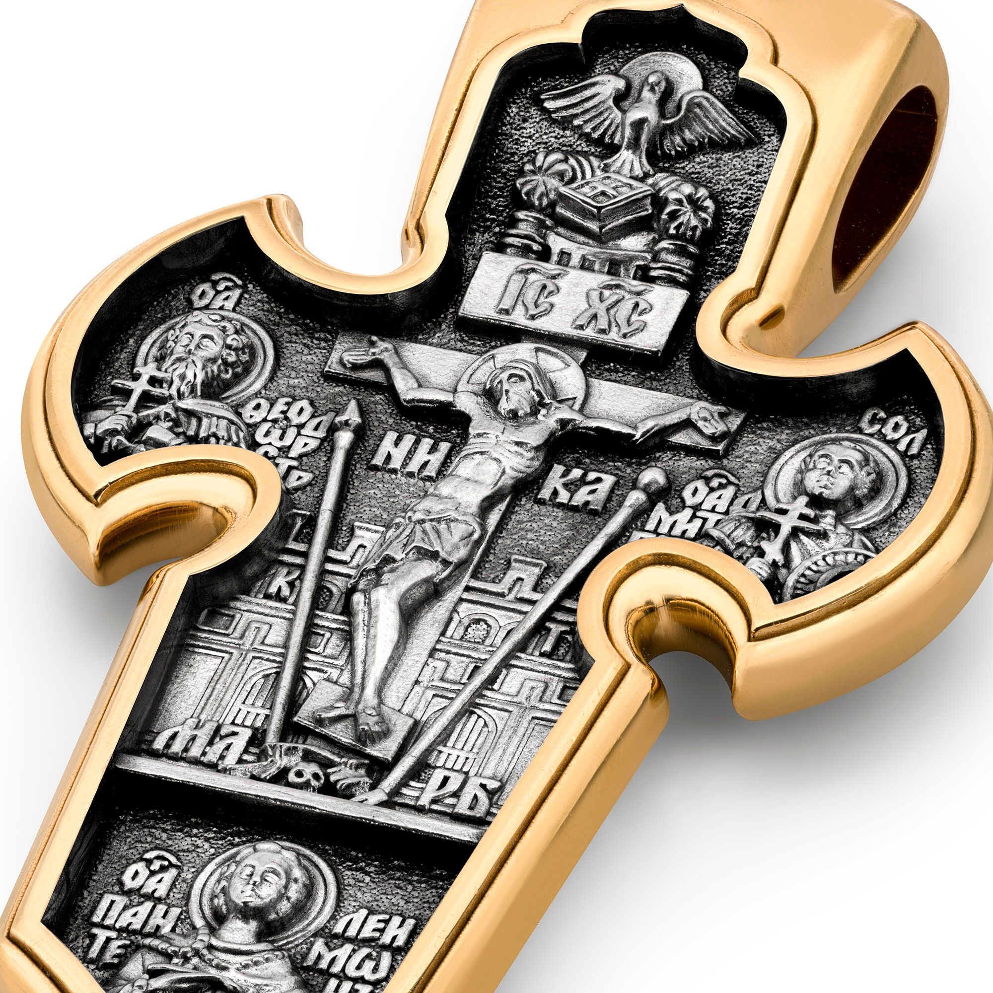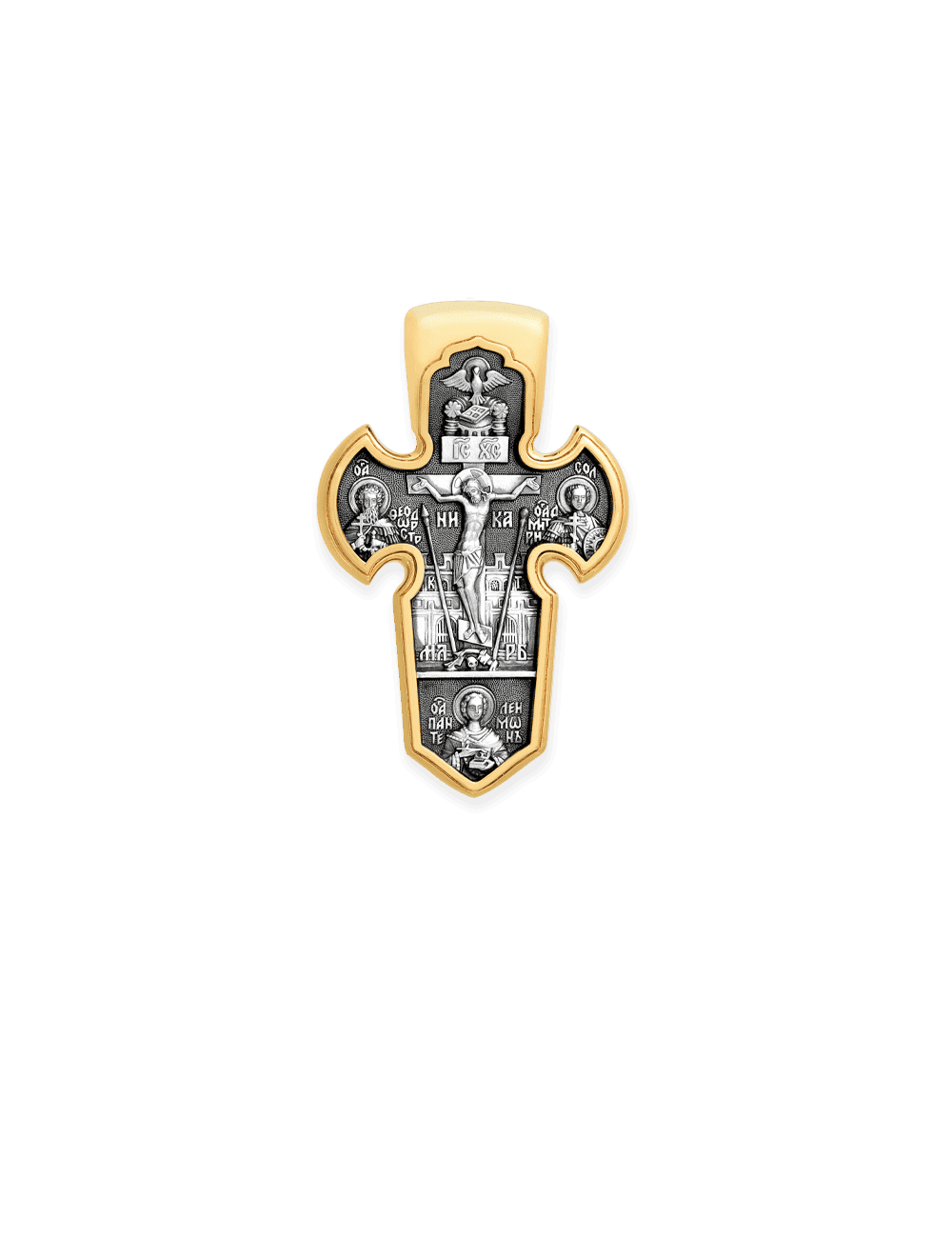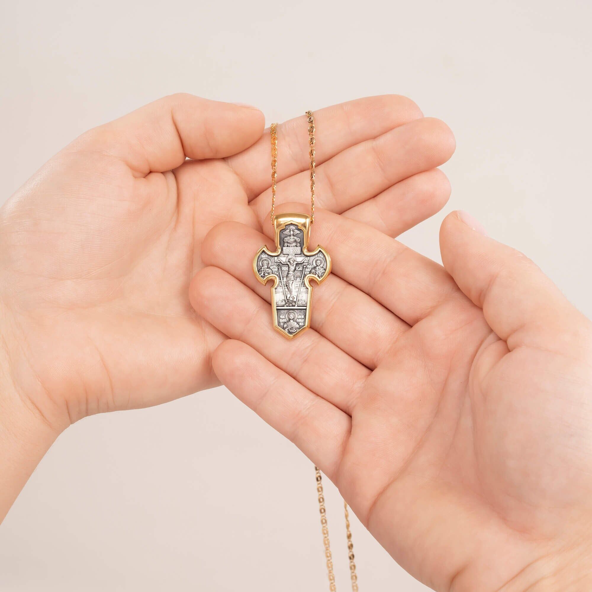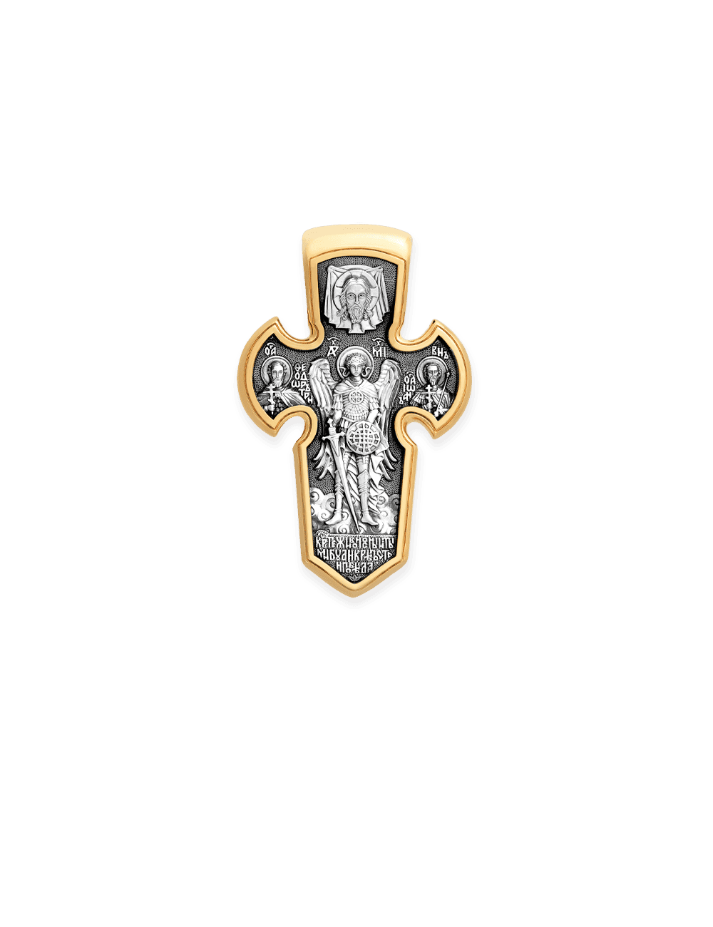 Russian Orthodox Cross Pendant CRUCIFIX. ARCHANGEL MICHAEL, 925 Sterling Silver & 24K Gold Plated, Akimov Jewelry