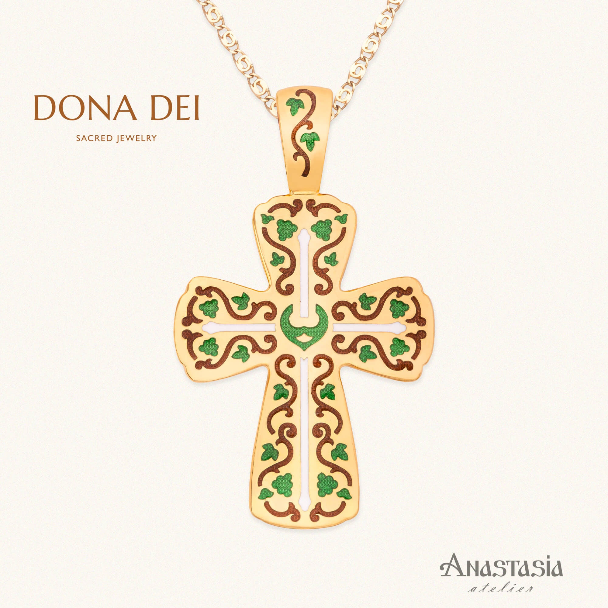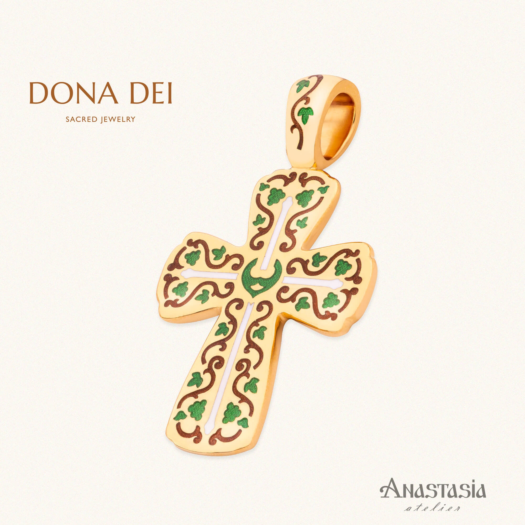 <...p>Symbolism and application of the itemCrosses, decorated with hot enamel are hand-made in accordance with the old Russian traditions. Each color has its own symbolic meaning. Golden or yellow is the color of the sun, green is the color of hope, white or silver symbolizes innocence and purity, purple or dark red is a symbol of Christ's blood and black is the symbol of death and hell. This cross is decorated with an ornament in the form of a vine. Many places in the scripture mention the vine, its fruits, and wine. Even the first prophets spoke of grapes as a symbol of the people of God. From ancient times, the attitude to the vine was tremulous, as to something sacred and blessed by God.